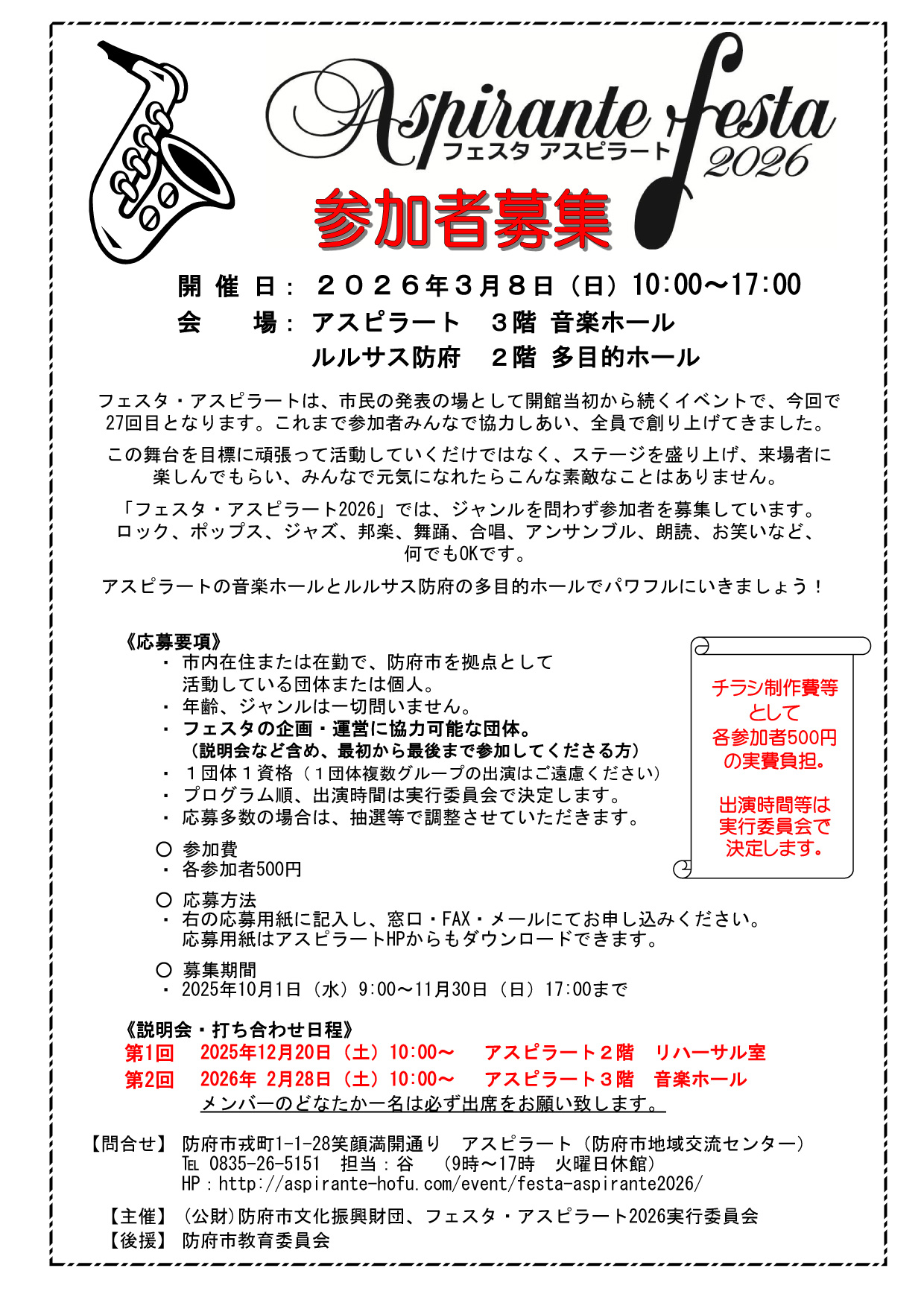 今年で22回を迎える定期演奏会。 観客の皆さんに楽しんで頂けるよう工夫を凝らしたオリジナルの演出と防府吹ならではのサウンドをお楽しみください。   とき 2025年11月 8日(土) 開場18:0 […]